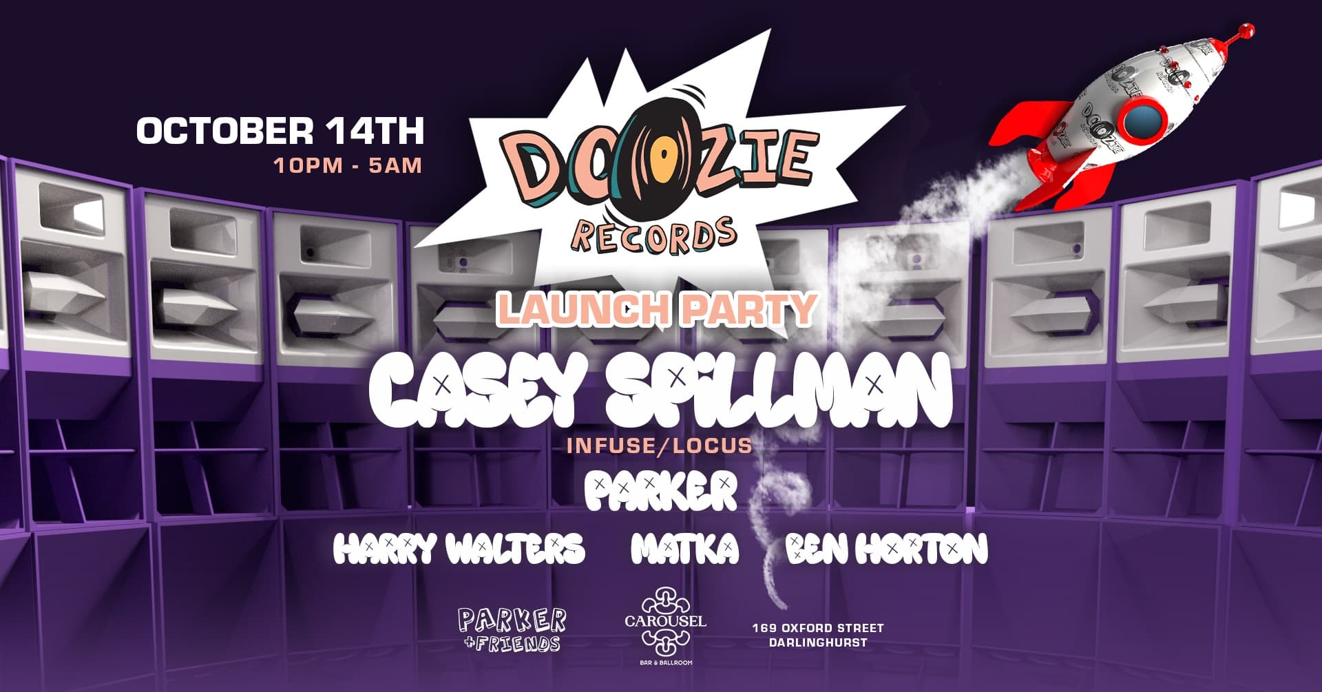 The Scene is Set, Parker & Friends Presents Doozie Records first ever showcase & label party, at Sydney's long anticipated hottest new & in demand club, The Carousel & Ballroom. Emerging from its digital veil any day now, the new Oxford Street venue steeped in glitz and mystique, proudly beckons you for a throwdown. And with XL cutting-edge lighting, and kitted out with a 32 piece Funktion One sound system, we can't think of anywhere better to cut the ribbon.